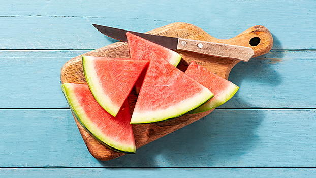 - Нарежьте арбуз толстыми пластами, удалите семена.