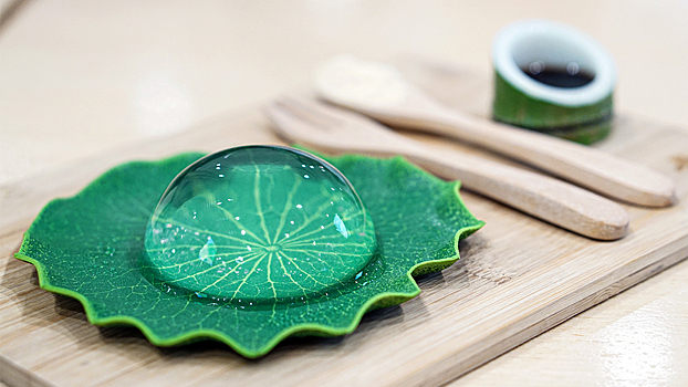 Он же — «призрачный моти». Прозрачный десерт, похожий на каплю воды. Вкус — нейтральный, акцент сделан на текстуру и подачу.
