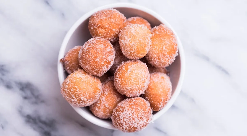 Для подачи готовые пончики окунают в растопленное сливочное масло, а затем обваливают в смеси сахара и корицы. Можно полить их шоколадом.
